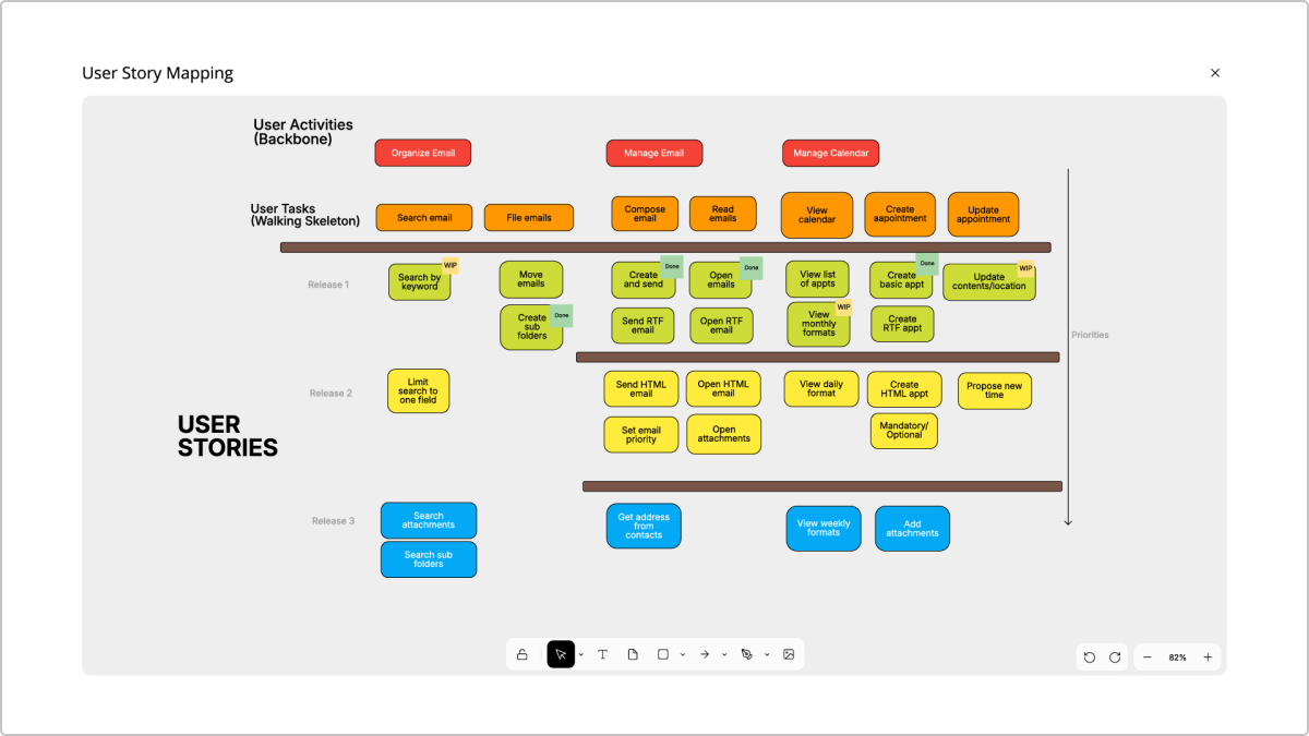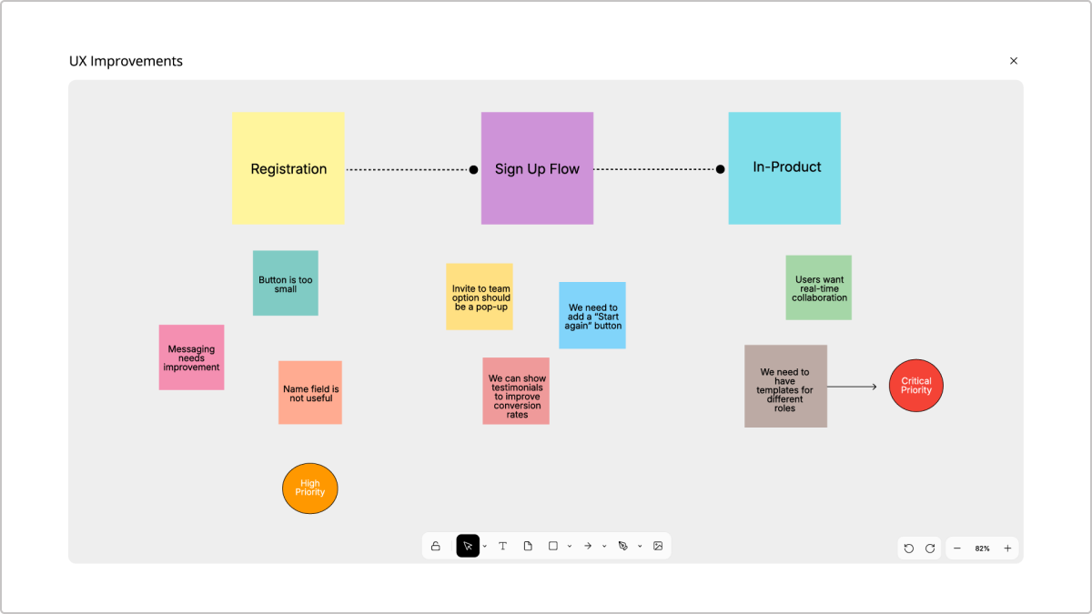 Think of a whiteboard as the place where you can digitally lay out your ideas with sticky notes, process symbols, and more. Every whiteboard is highly flexible, allowing you to: