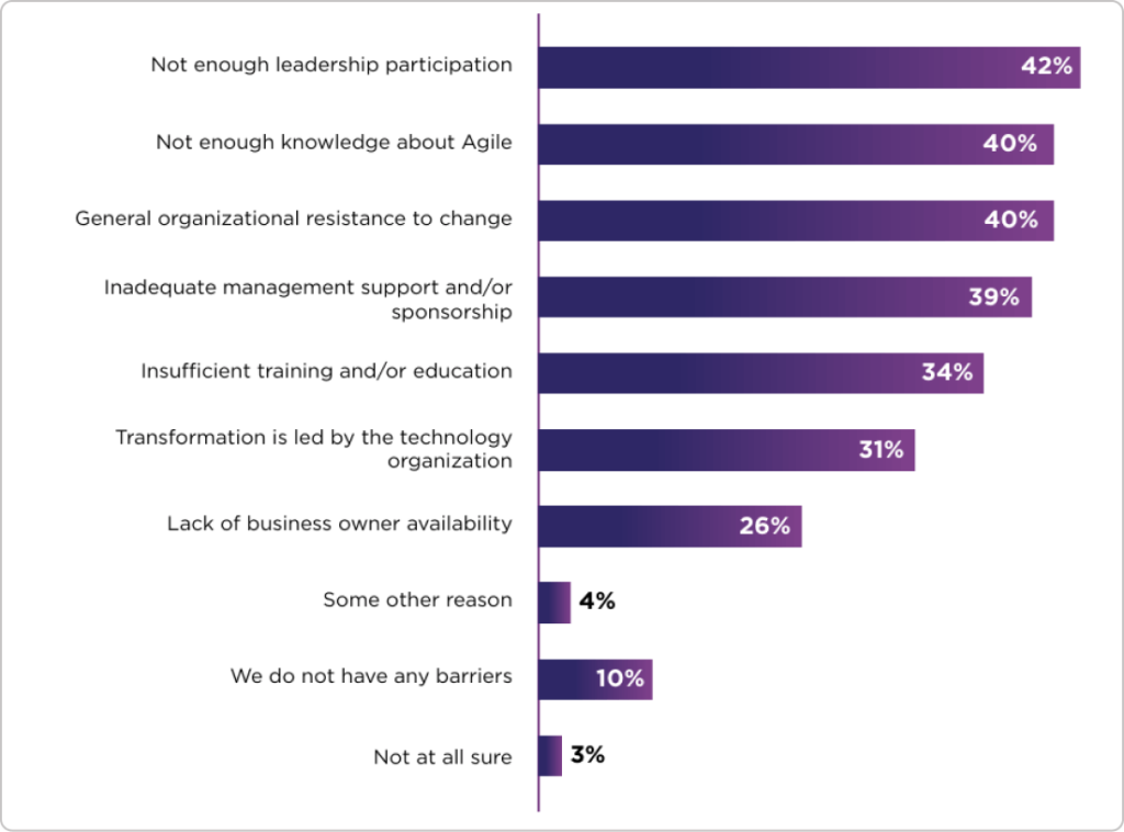To achieve business agility, companies must address the leading challenges of resistance to change and inadequate leadership management. (Source: The Business Agility Report) Success in this endeavor requires the full commitment of leadership to any Agile initiative. However, to be effective, the leadership role must adapt and evolve beyond traditional legacy leadership styles. Despite this, recent statistics on Agile adoption indicate that only 32% of business leaders are actively leading company-wide Agile transformations.