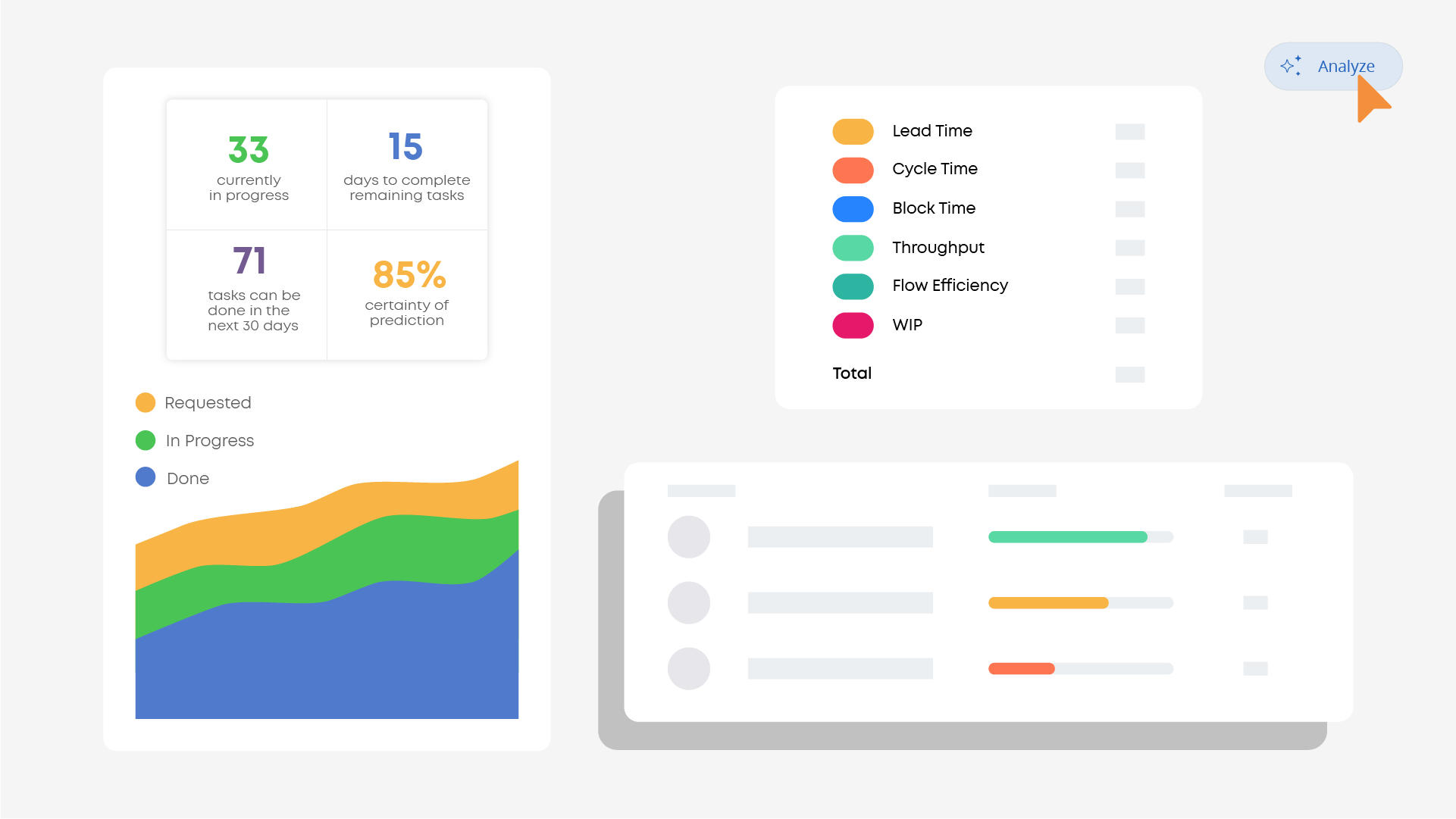 Oui. Non seulement cela, mais Businessmap dispose du module d’analyse le plus avancé du marché, désormais alimenté par l’IA. Cela signifie que vous n’avez plus besoin de lire les graphiques manuellement, mais laissez l’IA vous indiquer comment vos équipes performent, quels risques attendre et comment les atténuer.
